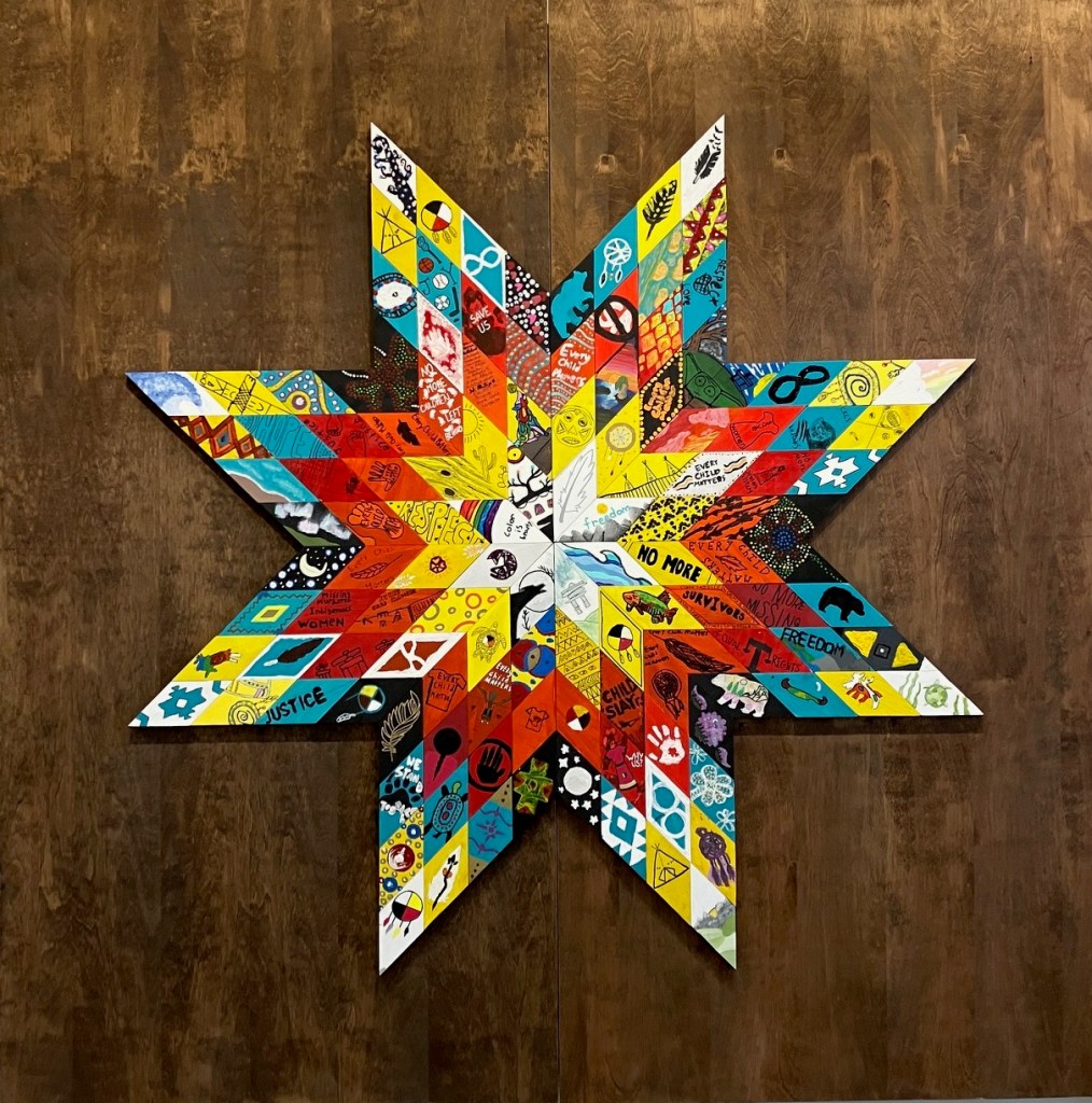 This collaborative mosaic is made up of 128 individually crafted wooden tiles, created by the Grade 8 and 9 students at Cut Knife Community School during the second half of the 2023–2024 school year. Inspired by a traditional star blanket design, each tile represents a personal expression of identity, culture, and history, woven together to form a powerful collective story.